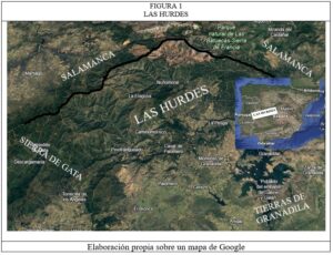 Las Hurdes se encuentran en la parte más septentrional de Extremadura, en el límite con la provincia de Salamanca. En la silueta cartográfica, la comarca parece incrustarse en la provincia charra como una especie de punta de lanza o triángulo, flanqueado en ambos lados de su base por las regiones cacereñas de Sierra de Gata y Tierras de Granadilla, que se encuentran en una latitud inferior. (FIGURA 1).