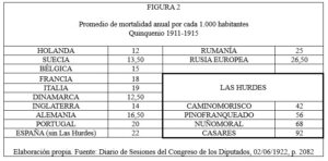 Una vez planteadas las necesidades viarias al ministro de Fomento, el diputado por el distrito de Hoyos se dirige al ministro de Gobernación, Pío Vicente de Pinés, para exponerle el estado sanitario de la comarca hurdana: «Por importante y por necesaria que pueda ser la construcción de caminos en Las Hurdes, es más necesaria porque es más urgente, la cuestión sanitaria, poner remedio a lo que allí ocurre. He dicho al principio que en Las Hurdes no había ni médicos, ni practicantes, ni una farmacia; ruego al Sr. Ministro y a la Cámara que se fijen en lo que esto significa…»[43]. Como resultado de la situación expuesta, añade que la mortalidad «rebasa todas las cifras conocidas no solo en Europa, sino en todo el mundo». En algunos casos, como el de Casares, en las Hurdes Altas, supera el promedio anual de 90 muertes por cada 1.000 habitantes. (FIGURA 2).