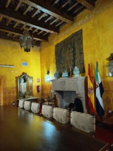 El 26 de abril de 1541, estando dentro de las casas principales, Diego de Carvajal se concertó con el cantero Pedro Gómez, “veçino que se dixo ser de la çibdad de Salamanca”, “estante en esta dicha villa”, para que le hiciera, a destajo, “en la dicha su casa una chimenea françesa que tenga ocho pies en luengo y una vara de medir de hueco, y toda de cantería por de dentro hasta el trasdós de las dovelas y con su can y sobrecan a la parte de fuera. Y más le a de poner los pisos de cantería que sean menester para entrar en la pieça donde se a de hazer j questos pisos sean de syete pies en largo y hen el fin destos pisos una portada toda de cantería con sus pies derechos y debolsores de una vara de medir en alto con su escaçanes de cantería de la parte de dentro y que sea capialçado”.