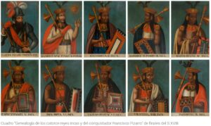 El Museo de Arte de Lima (MALI) presentaba en 2023 la exposición “Los incas: más allá de un imperio”[4] que reunía por primera vez más de 250 objetos arqueológicos y obras de arte, algunas inéditas o nunca habían estado al alcance del público. Entre estas piezas destacaba un lienzo del siglo XVIII en el que aparecían los14 reyes incas. Este tipo de representación era muy conocida, con series de gobernantes en los que Carlos I o Felipe II aparecían como sucesores de Atahualpa, como los fechados en 1725 del Museo de la Catedral de Lima, o el de 1745 de San Francisco en Huamanga. Curiosamente estos “lienzos de secuencia” se prolongaron en el tiempo llegando a exhibir primero a los incas, seguido de los reyes o virreyes hasta los presidentes de la República y eran muy habituales en el ámbito escolar. En determinadas épocas por motivos políticos se pasaba de los incas a los presidentes de la República, evitando mencionar a los monarcas españoles que gobernaron más de dos centurias, calificados como “reyes usurpadores”. El valor de esta pieza que se exhibía en la Exposición del museo era que quien seguía a los incas era Francisco Pizarro. La autoría se atribuía a Navamuel.