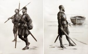 De izquierda a derecha, el primero está dominado por la figura de Pizarro. Lo sitúa sobre la arena delante de un bote que llevará a la nave a aquellos que quieren marcharse ( una nao porque tiene dos castillos en proa y popa). En este segmento, la parte natural está especialmente lograda con conseguidos efectos del humo en las brasas de la fogata, la espuma de las olas, las huellas de la arena y las nubes que surcan el cielo. La nave y el bote comparten el cromatismo de la madera y destaca especialmente su carácter volumétrico. Pizarro mira desafiante a sus hombres. Su postura es serena, pero con aplomo. Porta un peto sobre una cota de malla sobre el jubón a la moda de 1530. La cota está realizada a trozos y sujeta con cordeles y la espada es más que un elemento porque en ella – y la raya del suelo- recae el peso narrativo. Es una espada de punta y corte y guarnición de pitones con arquillos, una pieza común del siglo XV y XVI que por ejemplo llevaba el Gran Capitán. En el suelo ha dejado su casco, una protoborgoñota.  David Nievas ha acuñado esta denominación porque hasta 1530-1.540 no aparecen las borgoñotas clásicas. Comparten el esquema de la borgoñota: orejeras visera y agujeros para ventilar. ( Fig 8)