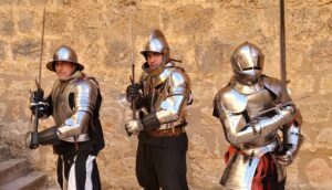 Imagen 6. Recreacionistas mostrando el equipo de los “aventajados”, soldados que recibían una ventaja o sobresueldo como recompensa por su servicio más arriesgado en los enfrentamientos, función equivalente a los “dopelsoldner” de los lansquenetes alemanes. Recreadores Rodrigo Ruiz Domínguez, Pedro Regalado Corral y Jesús Ruiz Moreno