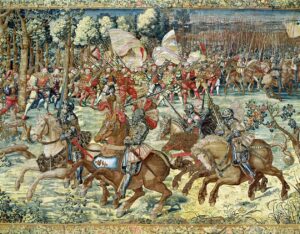 Imagen 8. Detalle del tapiz de Bernard van Orley en el que se observa la carga de la caballería francesa. Museo del Real Bosco Capodimonte. Napoles.